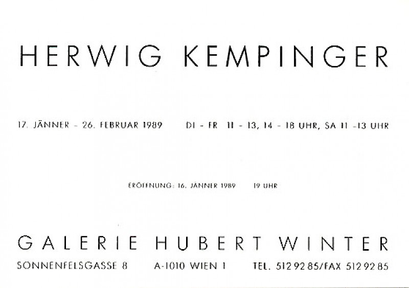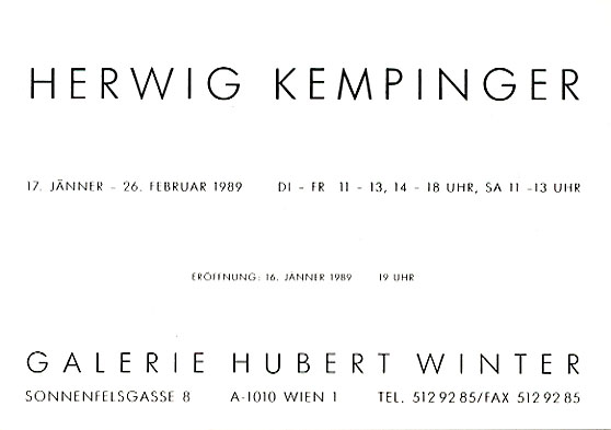 Einladungskarte "Herwig Kempinger", Galerie Hubert Winter, Sonnenfelsgasse 8, 1989.