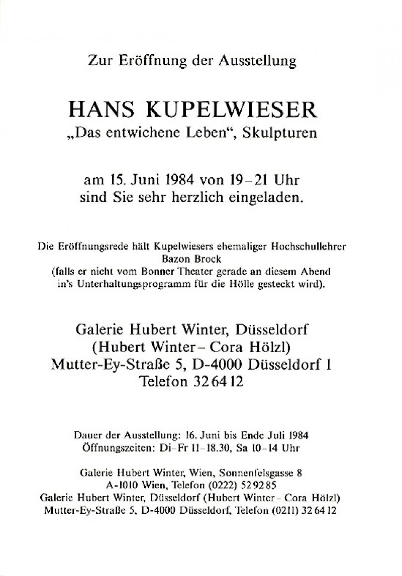 Die Eröffnungsrede hält Kupelwiesers ehemaliger Hochschullehrer Bazon Brock (falls er nicht vom Bonner Theater gerade an diesem Abend in's Unterhaltungsprogramm für die Hölle gesteckt wird).