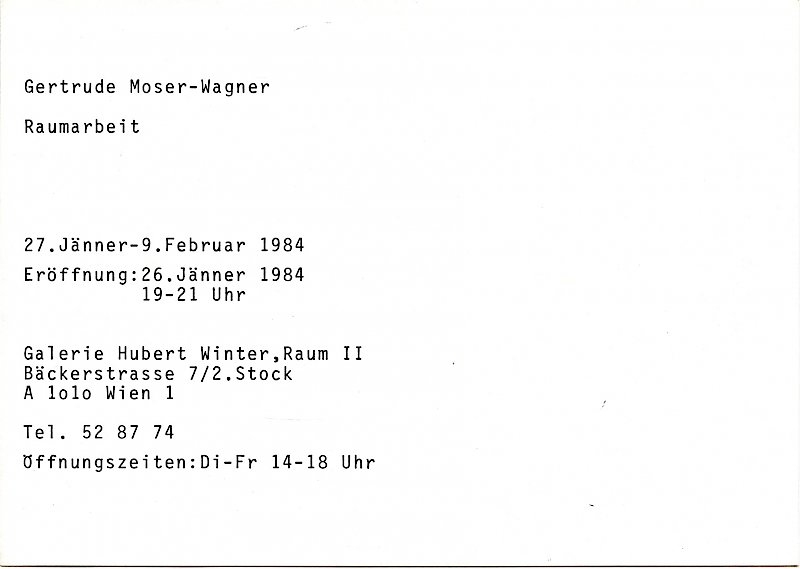Invitation, Gertrude Moser-Wagner "Raumarbeit", Galerie Hubert Winter, Bäckerstraße 7, 1984.