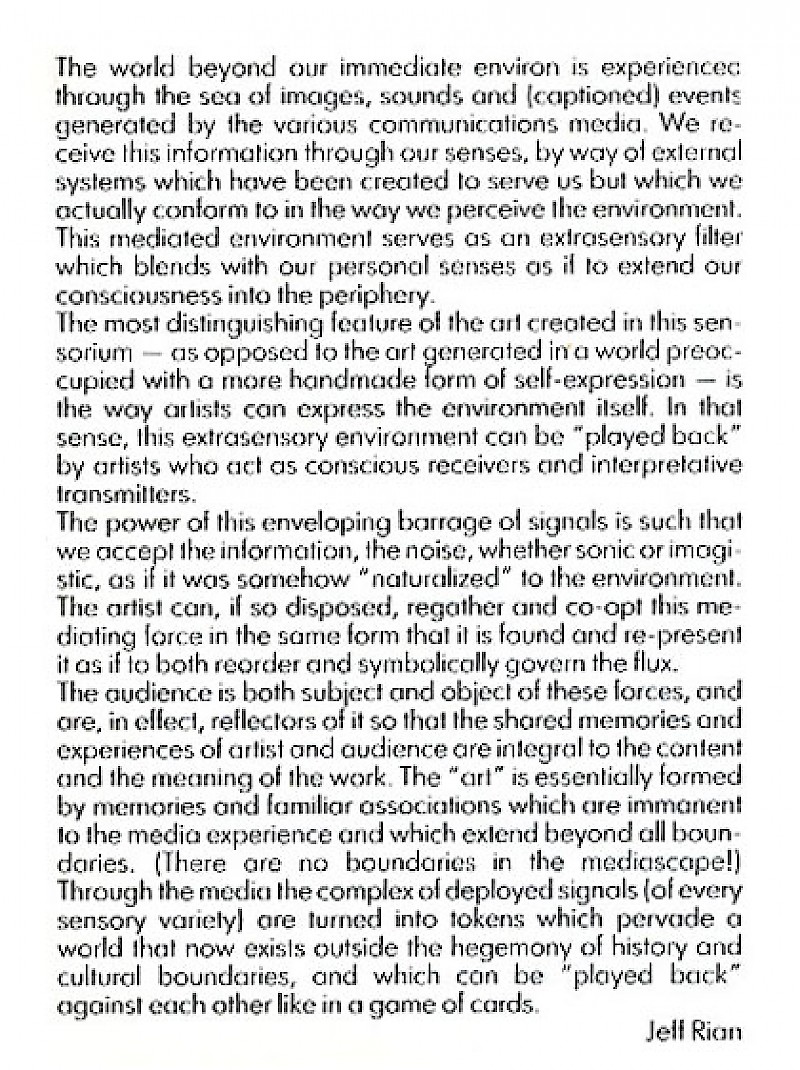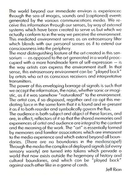 The power of this enveloping barrage of signals is such that we accept the information, the noise, whether sonic or imagistic, as if it was somehow "naturalized" to the environement. The artist can, if so disposed, regather and co-opt this mediating force in the same form that it is found and re-present it as if to reorder and symbolically govern the flux.