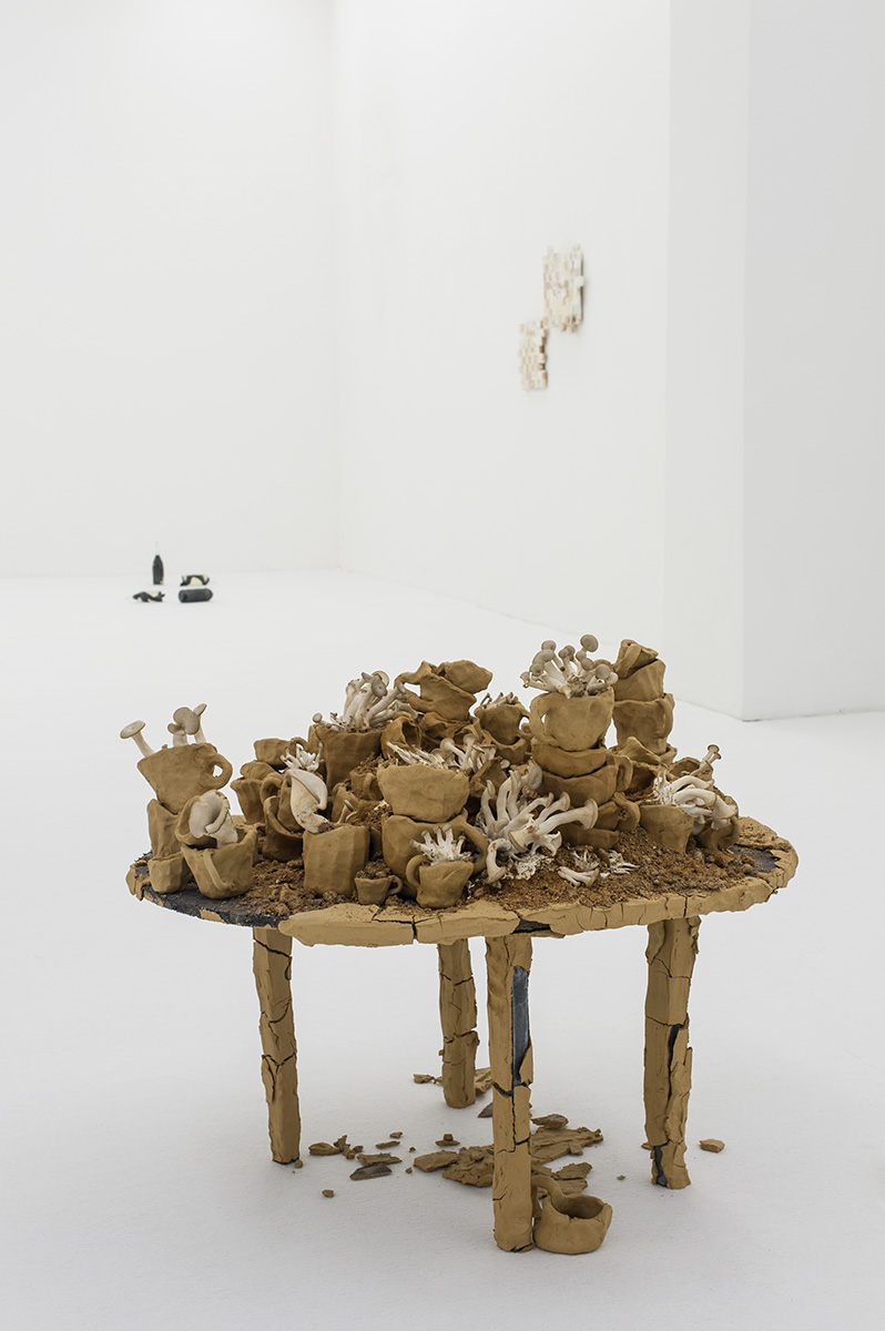 The fungus pleurotus ostreatus that is growing on this raw clay table (The fifth kingdom, 2016) works as an agent of decay, as their fruiting bodies blossom and wilt, their invisible, ghostly mycelium is slowly using up any nutrients provided in the soil, rendering it barren.