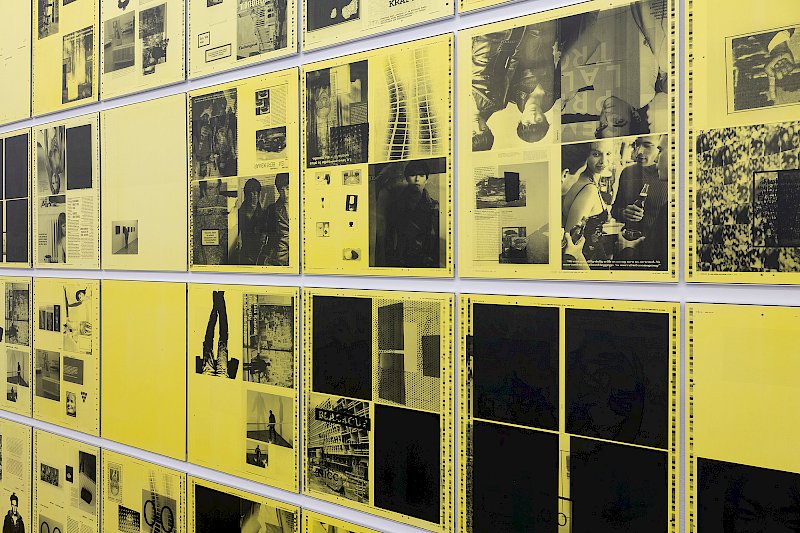 His 144-part wall piece The Printing Press as an Agent of Change from 2022 borrows its title from Elizabeth Eisenstein's pioneering publication on the history of letterpress printing and its significance for social change. Oorebeek uses the printing sheets from one of his catalogue productions, which are used at the beginning of a print run to calibrate the colour density of an offset printing press. These sheets are frequently reused, causing pages to overlap. Amidst this seemingly random arrangement of images and pages, a newspaper photo of Silvio Berlusconi, the founder of self-mediatisation in politics, repeatedly catches the eye. His reign marked a new economy of attention: the media’s overlay of politics with the visual omnipresence of the banal.