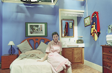 Die neunteilige Fotoserie mit dem Titel electro domestica, die in der Ausstellung zu sehen ist, ist als selbstständiger Beitrag zu einem gemeinsamen Ausstellungsprojekt mit den Künstlern Alejandro Mancera und Luz Marina Trellez zwischen 2003 und 2004 entstanden. Die Künstlerin setzt sich darin selbst ins Bild und schlüpft dazu in die Rolle eines Hausmädchens. Die mutmaßlich gutbürgerlichen Besitzer des ansehnlichen Wohneigentums, das auf der Mehrzahl der Fotos ihre Umgebung darstellt, sind faktisch nicht sichtbar und scheinen doch mittelbar präsent. Klar weist sich die Bildprotagonistin in ihrer Dienstbotenuniform als Fremde in der Welt der Begüterten aus. Das Dienstmädchen ist zwischen perspektivisch monumentalisierten Küchenmöbeln eingezwängt. Die Rolle passt. Dabei bleibt hinter einer anrührenden, die Grenzen zum Sozialkitsch erkundenden Sentimentalität der Verweis auf real existierende Existenzmodelle bestehen. Gerade durch das Vorzeigen der Konstruiertheit des Rollenspiels, in der Überlagerung der Identitätsschichten von Schauspielerin und Künstlerin, welche wiederum zum eigenen (Foto-)Modell wird, gewinnt das – auch auf mehreren medialen Ebenen stattfindende - Szenario an spannungsvoller Intensität. Das eingefrorene Bild des fotografischen Mediums verdoppelt sich auf nicht weniger als drei der neun Fotografien noch einmal in der ‚selbstreflexiven’ Spiegelung, die auf einem Kühlschrank sichtbar wird. Eine Bildebene überlagert die andere. Noch eine weitere kommt hinzu, sobald man erfährt, dass es sich bei den kulissenhaften Interieurs tatsächlich um nichts anderes als das Set einer in Kolumbien populären Telenovela handelt. Sind einige der Fotos klar, geradezu streng geometrisch komponiert, so zeigen sich in der Bildfolge allmähliche Auflösungserscheinungen, die nicht nur das Formale, sondern auch den Inhalt betreffen. Beleuchtungskörper und die Ränder der Dekoration treten unvermutet ins Blickfeld, stellen das idealisierte, kohärente Bild der gutbürgerlichen Kulissen in Frage. Betrachtet man die Serie in ihrem Gesamtablauf, so drängt sich geradezu der Eindruck einer Filmsequenz auf, einer filmischen Narration, die uns freilich nicht bloß von den Sehnsüchten eines Hausmädchens erzählt, sondern die über Prozesse der Bilderproduktion selbst Rechenschaft ablegt. Die Fotografie wirkt dabei als analytisches Distanzmedium. Sie imitiert in der Reihung den filmischen Ablauf, um ihn rückwirkend zu dekonstruieren, um den Illusionismus der Fernsehepisode in seine Bestandteile zu zerlegen. Diese Bezugnahme auf den kollektiven Bildfundus der Generation der Fernsehkonsumenten erinnert wiederum an die Film Stills von Cindy Sherman. Bei Ribero steigt die Fotografin wie Alice im Wunderland durch den Märchenspiegel des Mediums Fotografie direkt in die Fernsehserie ein und etabliert mit ironischer Ernsthaftigkeit eine eigene Figur, die im Drehbuch der Soap-Produzenten gar nicht vorgesehen war.