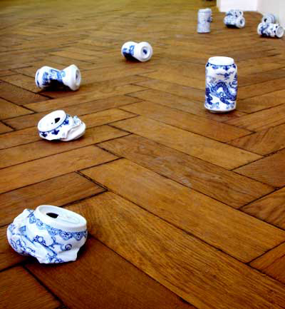 In meinen Arbeiten habe ich versucht, mit unterschiedlichen Materialien und Formen meine dahinter stehende Ideologie aufzuzeigen. Die Themen Ming und Coca Cola stammen aus diesen Überlegungen. Mit handbemaltem blau-weißem Porzellan auf einer verbrauchten Cola- Dose habe ich Material und Form zusammengebracht. So präsentiert meine Arbeit das Denken über das menschliche Bedürfnis Trinkenunter Einbeziehung der althergebrachten Mingbeziehung in der gegenwärtigen Cola- Zeit. Dabei wird sehr feines handbemaltes Porzellan angehäuft, so wie gestrandeter Müll auf dem Boden. Den Hintergrund bilden zwei Videos, auf denen ich Tee in unserer schnell bewegten modernen Umgebung mit großen Genuss trinke.