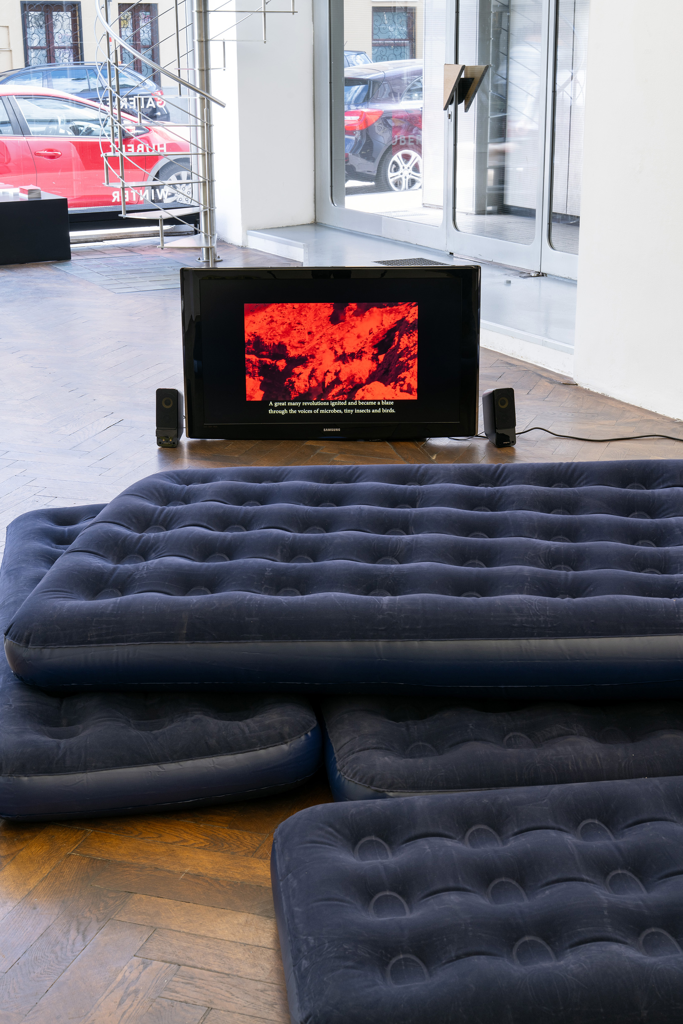 Images of an abstract landscape bathed in red light with an inserted view from an aeroplane, underlaid by a whispering voice that speaks of symptoms whose origins remain hidden. It speaks of the love of others that it eavesdrops and of the hype of the virtual, which is spreading like an epidemic. It itches when it is infected. Where the vaccine was injected. Where the scab formed. My symptoms resemble many stray words. Densely leafed trees, birds on a roof, a gentle bounce on a trampoline: Jieun Lim's works use images as metaphors that refer to what eludes a solely communicative language. The inner speech that emanates from them creates a resonating space that targets those levels where certainty is not an option: beyond the rules of pragmatism and the logic of semantic precision – pure articulation of fragmented subjectivity.